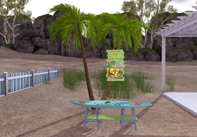 Decor items, each sold separately for the Creative Spark July 1-15 at the main store. There are Adult and PG versions of the bench. Each animated with dances, cuddles, bento singles and adult for adult version. The palm with sign is also available for purchase to complete the look.