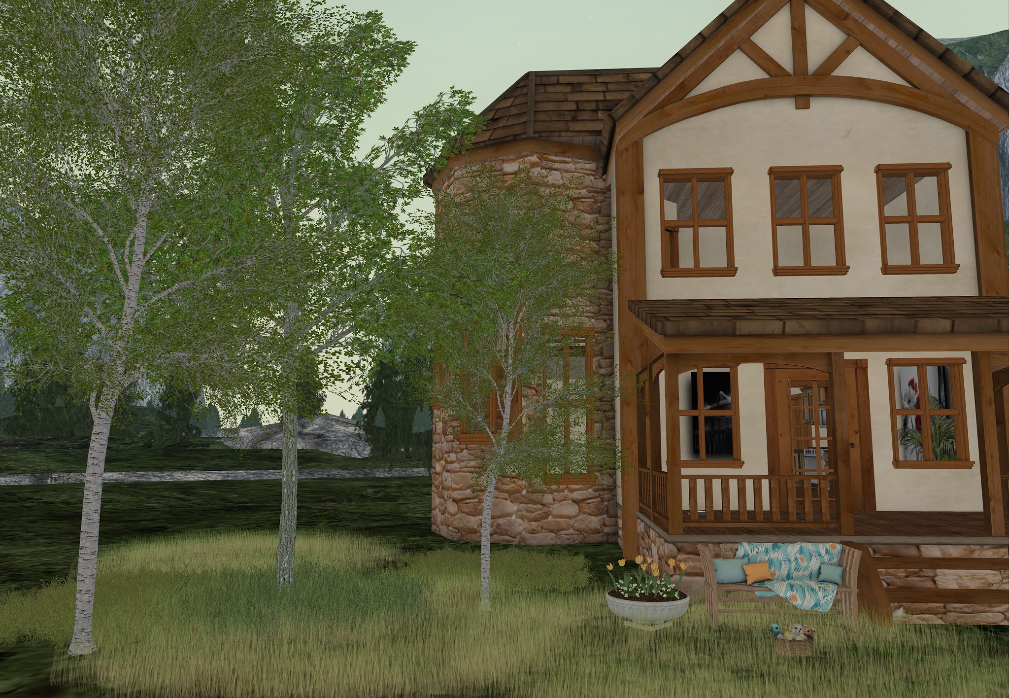 Two bedrooms, two porches, a texture change kitchen, and lots more! There are two fireplaces, with options such as logs with fire, candles and chimney smoke. The kitchen includes a refrigerator and stove each with rezzable food. Click the faucet to turn on and off the running water at the sink.