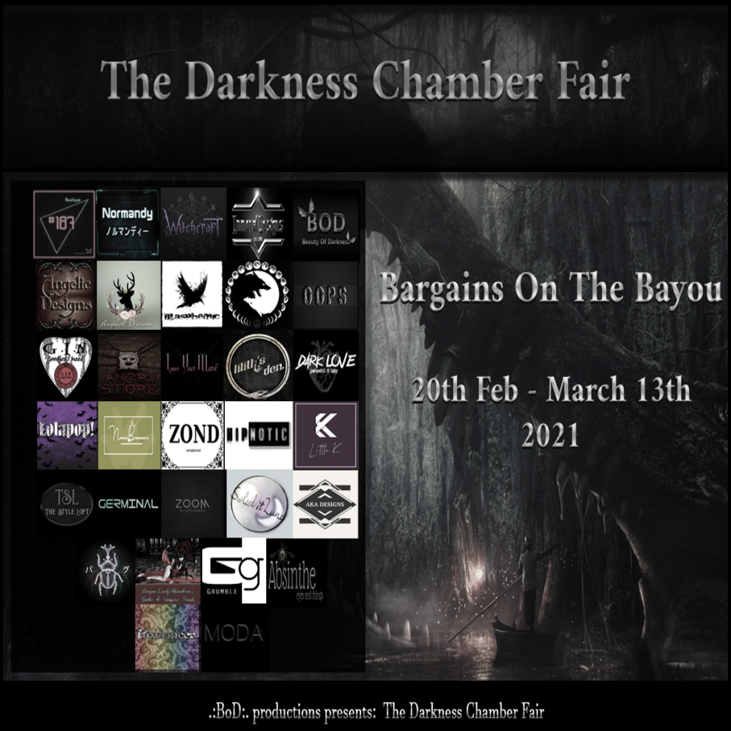 Items to win include smoke, demon eyes, demon tongue, aura pop, crown and invocation circles in 3 possible colors. Rare are boots to fit Maitreya, Legacy, Belleza, Kupra, Signature and Slink in 3 colors. Ultrarare is catsuit all colors to fit  Maitreya, Petite, Legacy, Perky, Alice, Isis, Freya, Venus, All Kupra, All eBody, Hourglass, and Physique. On sale at The Darkness Chamber Fair's Bargains on the Bayou Discount event February 20 - March 13