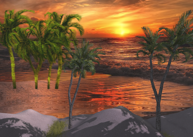 A beautiful sunset at the beach, with just the right amount of a breeze to send those palm trees swayin.