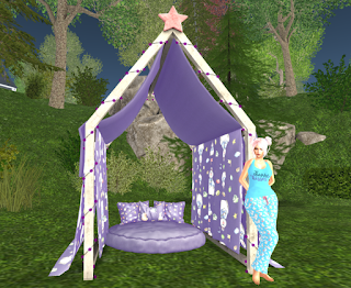 This is a really cute item and you have your choice of 10 different textures and your choice of 4 different colors!  I of course love purple and the bunnies goes great with my jammies!  The menu is hugggeeee with a 70 pg, 117 mf and 30 ff animations and they are very nice quality too!  As you can see I just standing here waiting for my slacker partner so i can use to camp out in my backyard!